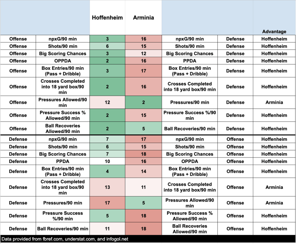 Hoffenheim has been on of the league's more prolific offenses, averaging 1.69 NPxG per match. They’re also top three in big scoring chances, box entries and crosses completed into the penalty area. Arminia is one of the three worst teams in the Bundesliga in both box entries and cross completed into their own penalty area, so Hoffenheim should have no trouble creating chances.