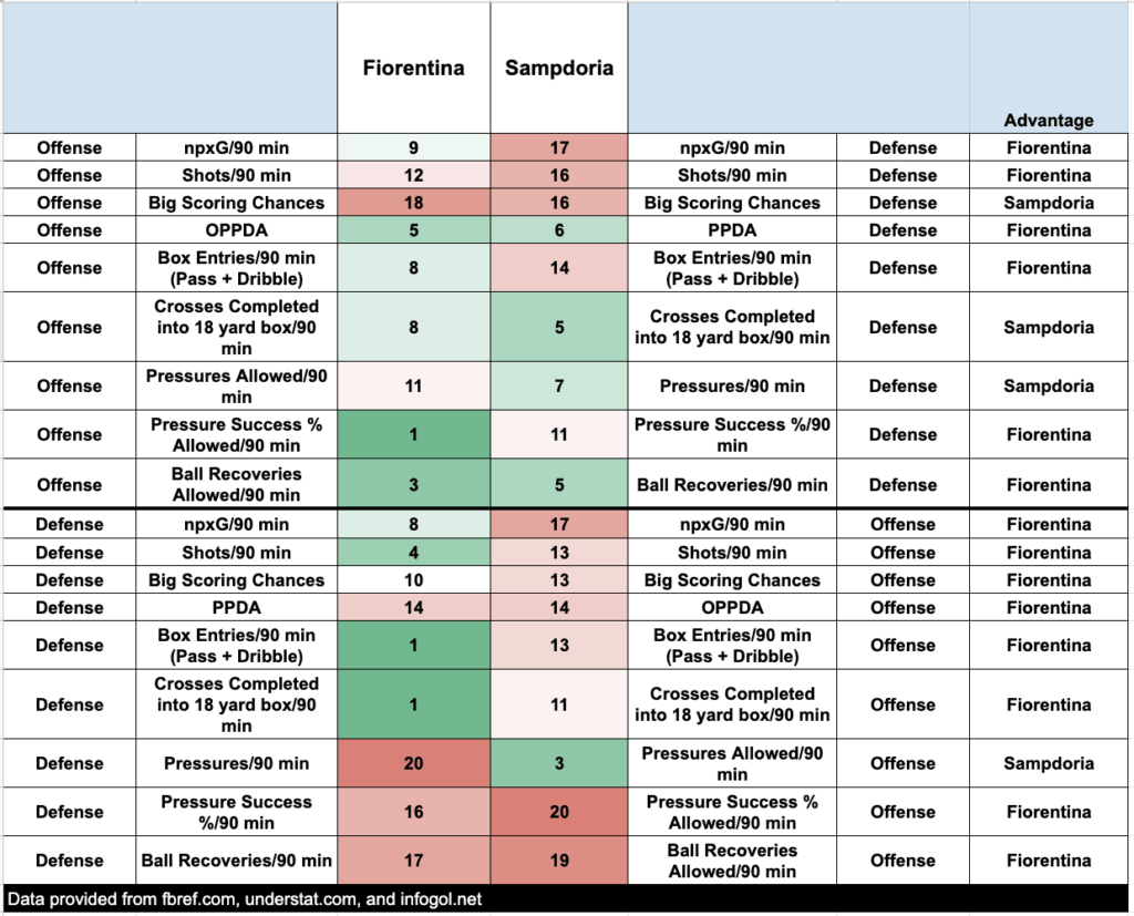 Defensively, Fiorentina has been rock soli, conceding only 1.09 NPxG per match, which is eighth in the league. They're also No. 1 in box entries allowed and crosses completed into their own penalty area, per fbref.com. So, it's going to be very difficult for Sampdoria to create anything going forward.