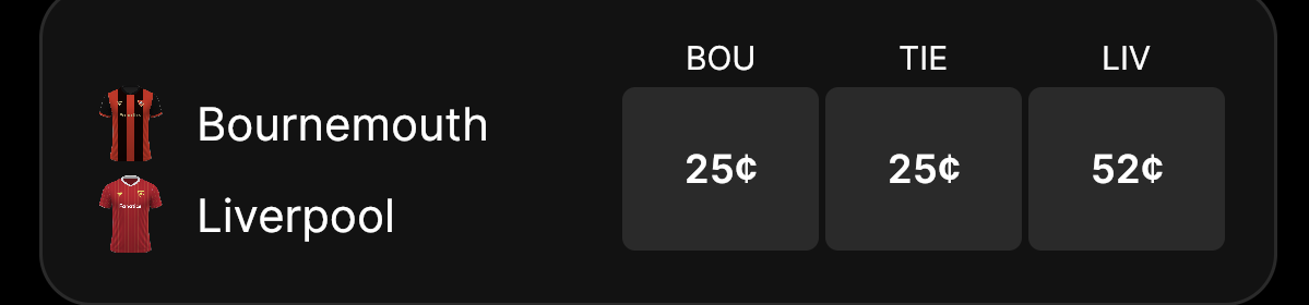 Liverpool is favored at a 52-cent price, with the over/under set at 2.5 goals at Fanatics Markets.