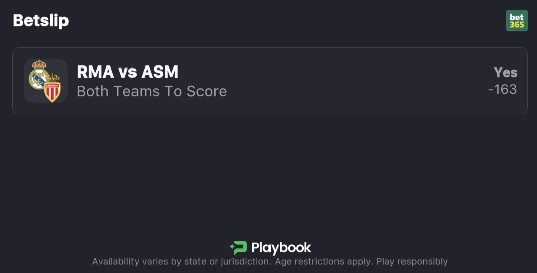 My Monaco vs. Real Madrid best bet is for both teams to score.