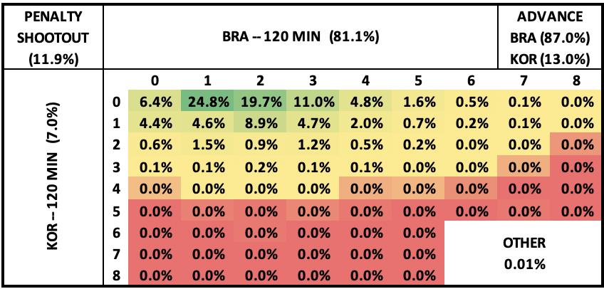 - Brazil are 72.6% favorites to win in regulation and 81.1% to win prior to a possible penalty shootout.