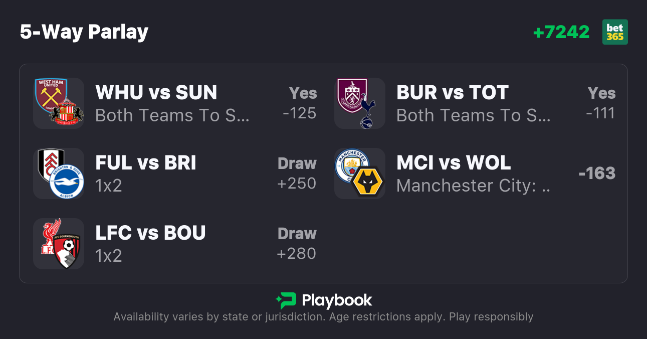Parker’s team comes into this clash having conceded in its last 10 Premier League games, and with Burnley’s attacking output improving, we should see chances at both ends. Both Teams To Score – Yes has won in four of Burnley’s last five competitive matches, with those matches averaging 3.6 goals per game.