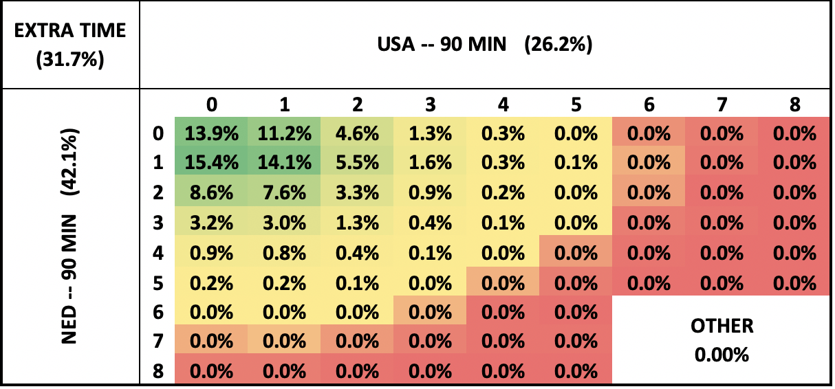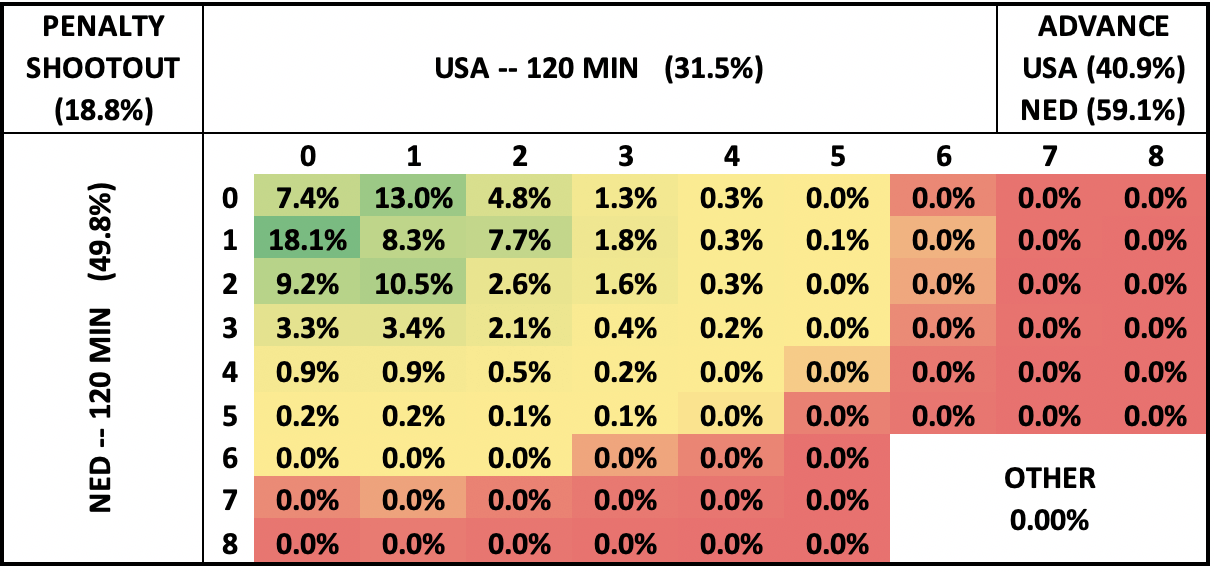 - The Netherlands are 42.1% to win in regulation and 49.8% to win prior to a possible penalty shootout.