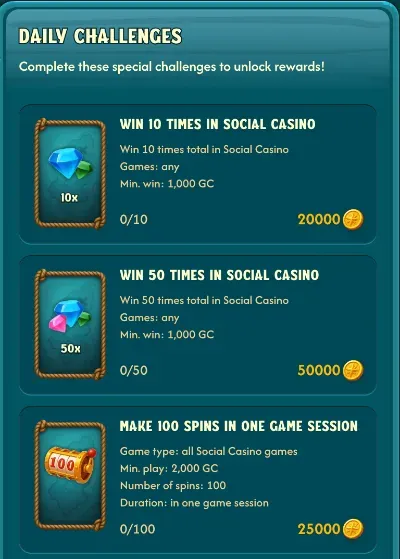 Big Pirate Casino offers numerous different challenges and tournaments to complete daily and weekly. These challenges are tied to spinning slots for a specific amount of time or winning a certain number of gold coins and diamonds in the casino games. If you are lucky enough to complete any of these challenges, you will get rewarded with free gold coins and diamonds. For the tournaments, you have to achieve the highest scores on specific names to be rewarded with gold coins and diamonds.