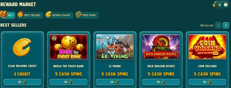 The reward market is a place to spend rum that you have earned or bought through various methods. You will find lots of unique rewards to buy, including claw machine tokens and free spins with either diamonds or gold coins. This rewards market will continue to be updated weekly, and we expect Big Pirate Casino to continually add more rewards.