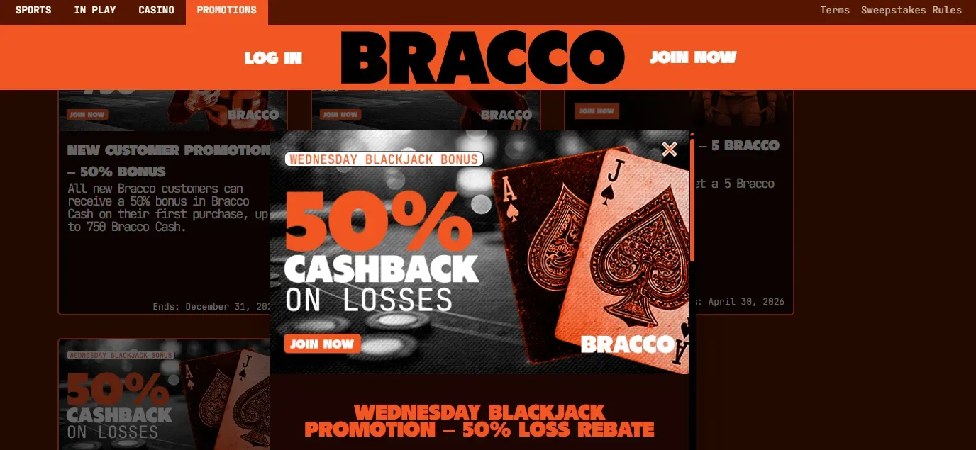 PlayBracco Casino allows players to receive 50% of their net losses as a Bracco Cash Bonus, up to $500, when playing American Blackjack on Wednesdays. The bonus, subject to a 30x rollover requirement, can be used for future bets across eligible games, with winnings retained and credited within 24 hours.