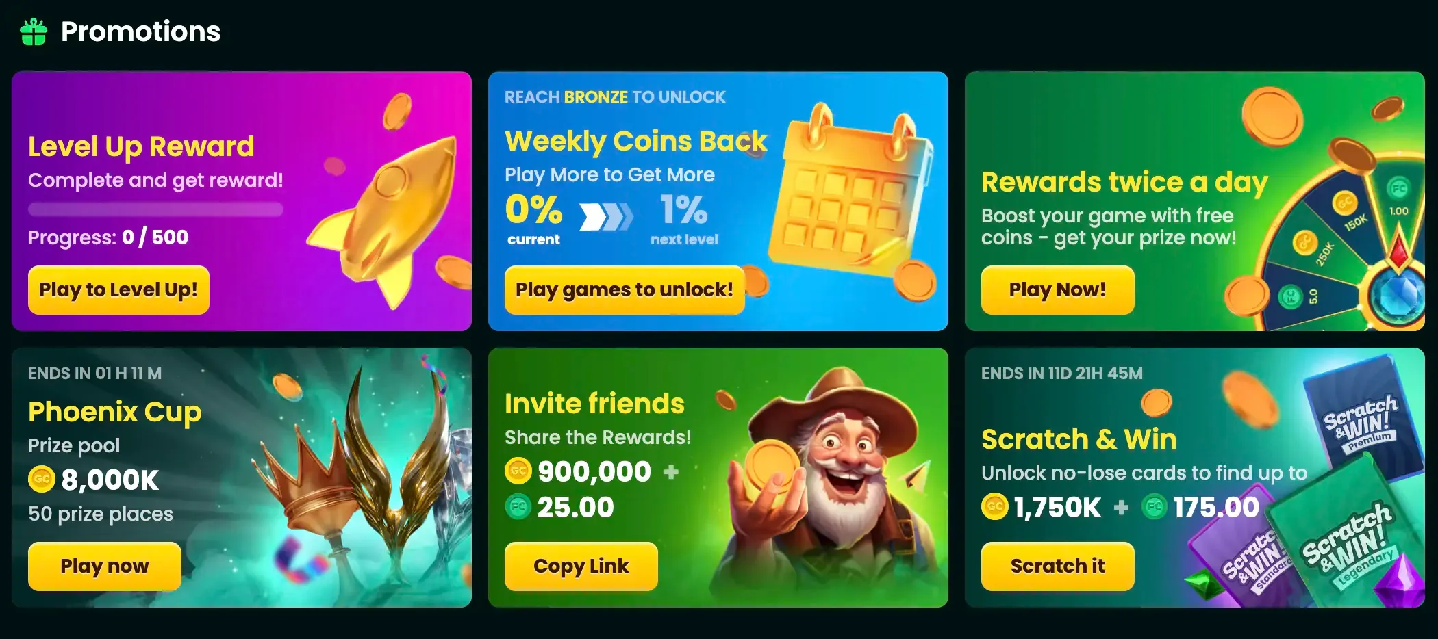 The Fortune Wheelz Casino Scratch & Win Promo is perhaps its most unique of the bunch. Simply collect free Fortune Coins through various promos or by purchasing GC bundles, fill the scratch progress bar, and unlock different scratch cards.