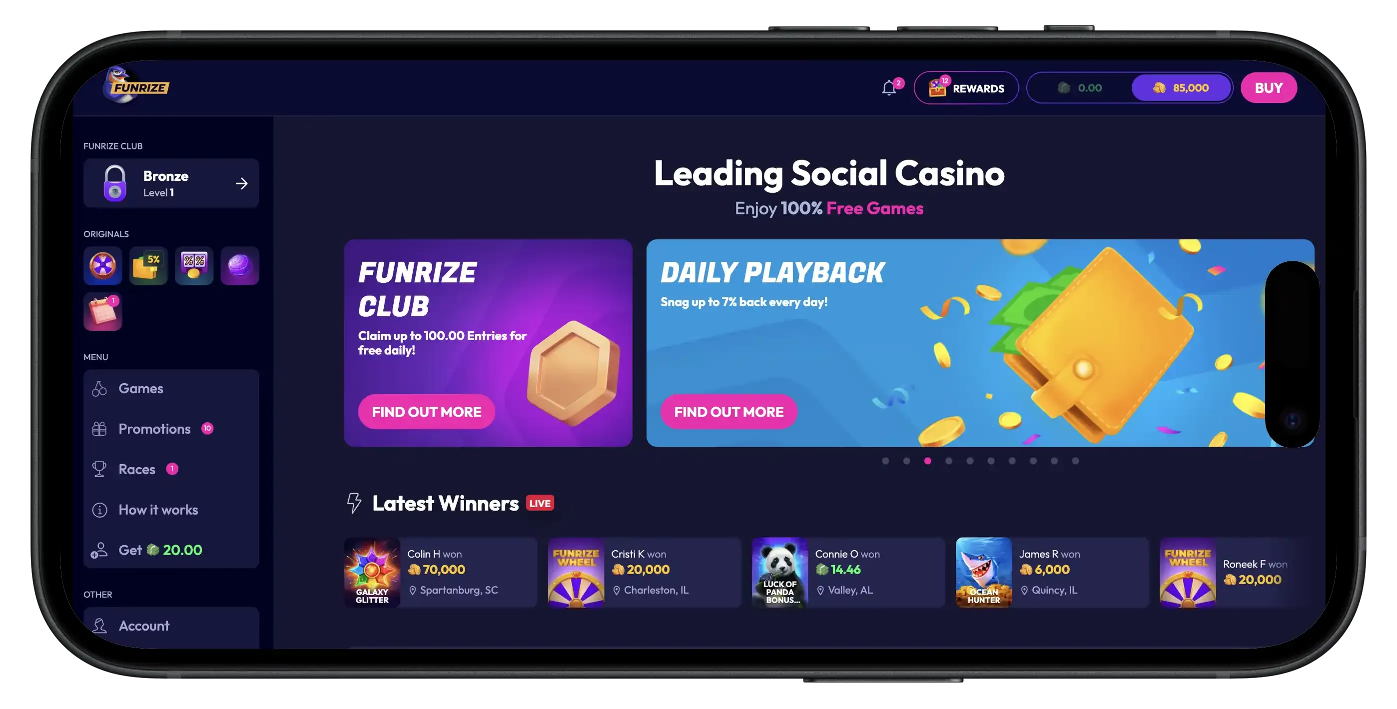 As a leading social casino, Funrize offers a unique blend of entertainment and the chance to win real cash prizes through its engaging casino games library from a desktop or on your mobile device.