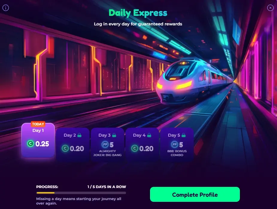 Simply log-in to FunzCity Casino every 24 hours to grab your guaranteed Daily Express rewards. The prize you'll earn on any given day will depend on how many consecutive days you've logged in, with rewards maxing out at 5 days before re-setting. Players can either earn City Coins or 'FreePlays', which are the same thing as bonus spins.