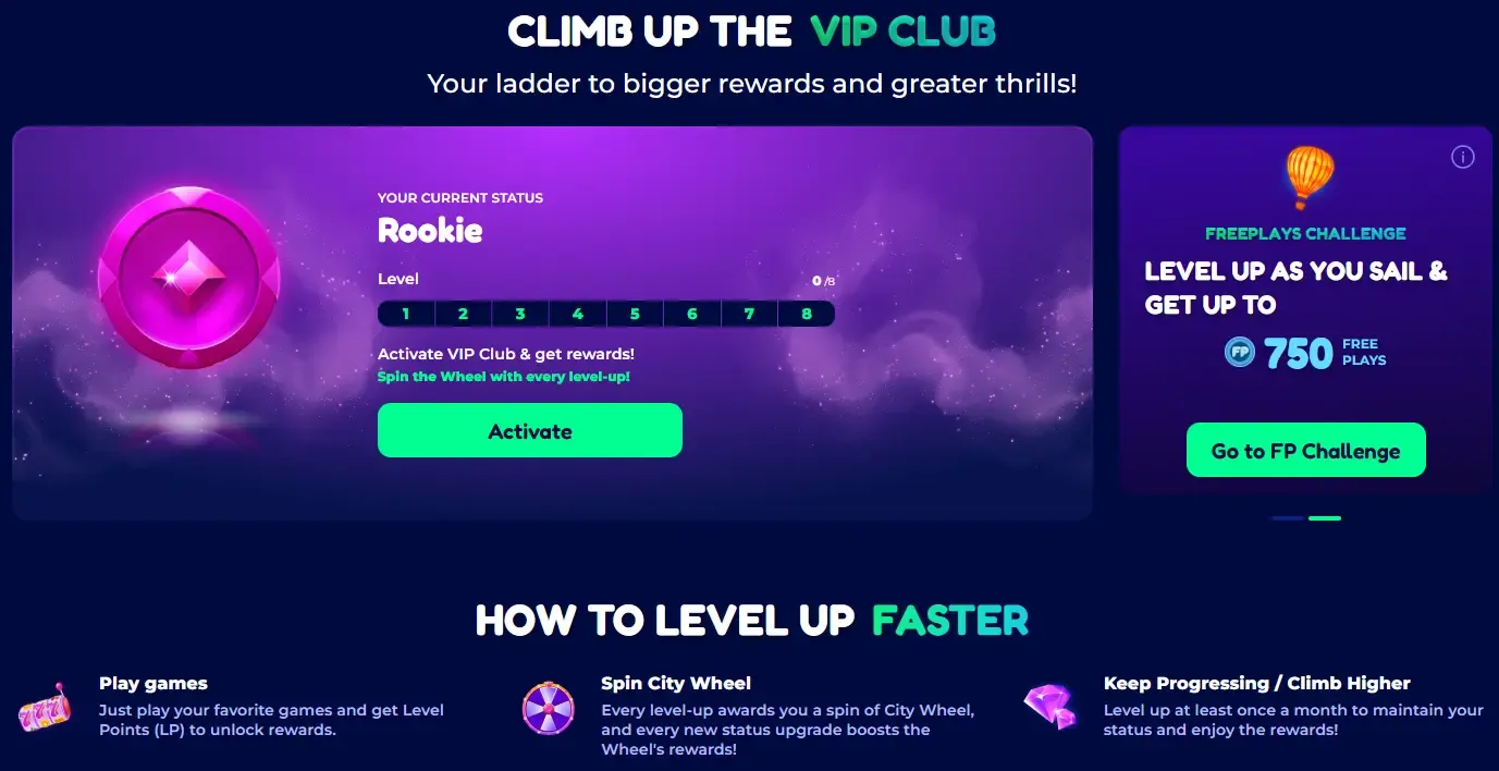 | π VIP Status Level | π City Wheel Top Prize | π Daily Express Rewards | π° FreePlays Challenge | π€ Exclusive Promotions | πΈ Daily Playback | β¬οΈ Daily Playback Maximum |