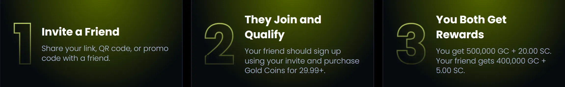 - After your friend signs up, completes verification, and makes a qualifying purchase totaling $29.99, you receive 500,000 GC and 20 SC.