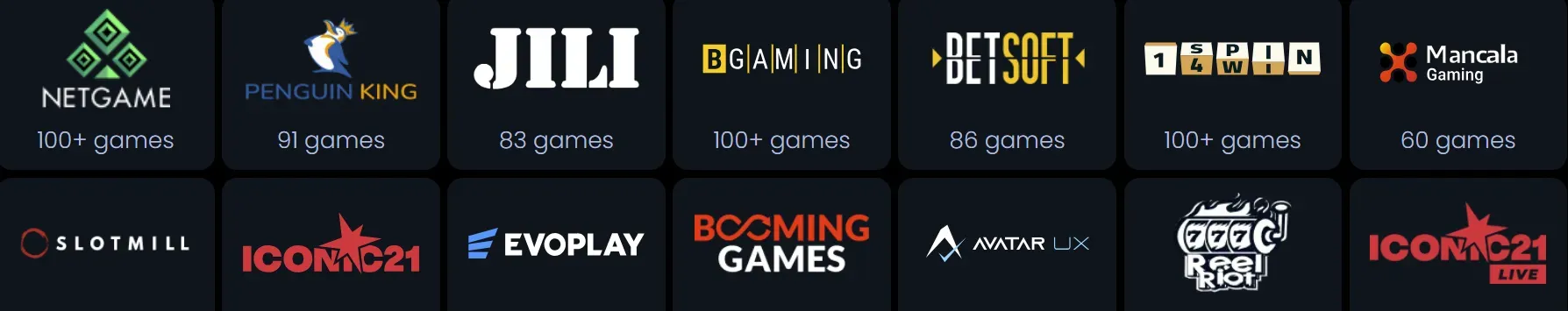 | 💿 Software Developers | NetGame, Penguin King, Jili, BGaming, BetSoft, 1Spins4Win, Mancala Gaming, Slotopia, Novomatic, Slotmill, ICONIC21, Evoplay, Booming Games, Avatar UX, Reel Riot, ICONIC21 Live. |