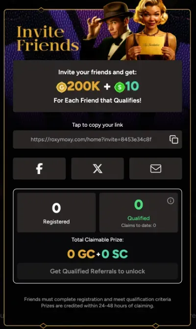 Roxy Moxy's invite a friend program allows you to send your unique code to someone and if they sign up, you will get rewarded with 200,000 Gold Coins + 10 Sweeps Coins. However, in order to qualify for the bonus, your friend needs to spend $40 or more on coin packages within the first 48 hours of account creation.