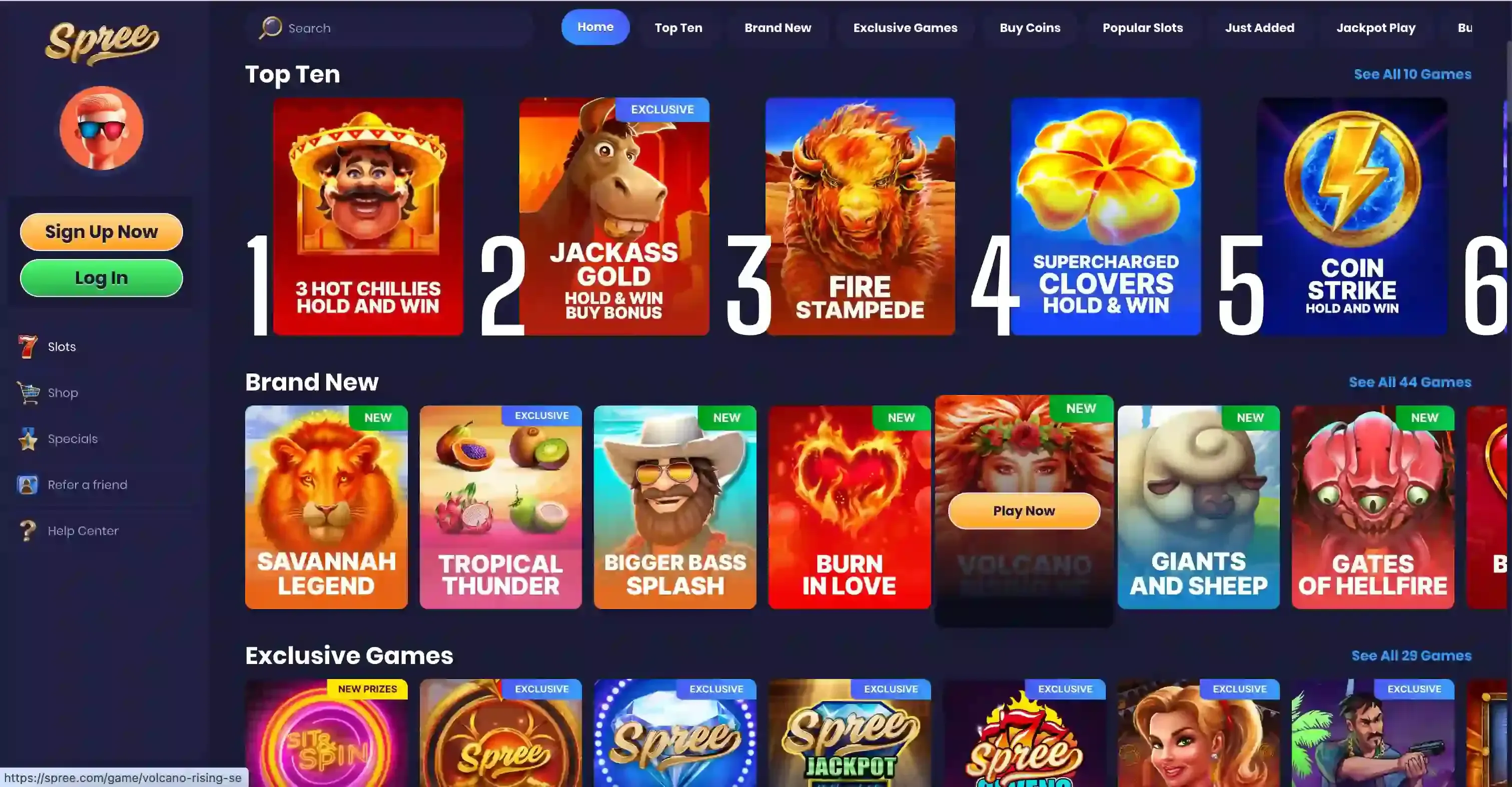 You can also scroll vertically to view categories, including the Top Ten, Brand New, and Just Added titles. Jackpot Play is also a great place to start with your free GC and SC bonuses. Thereโs also a sidebar menu at Spree where players can choose from various options.