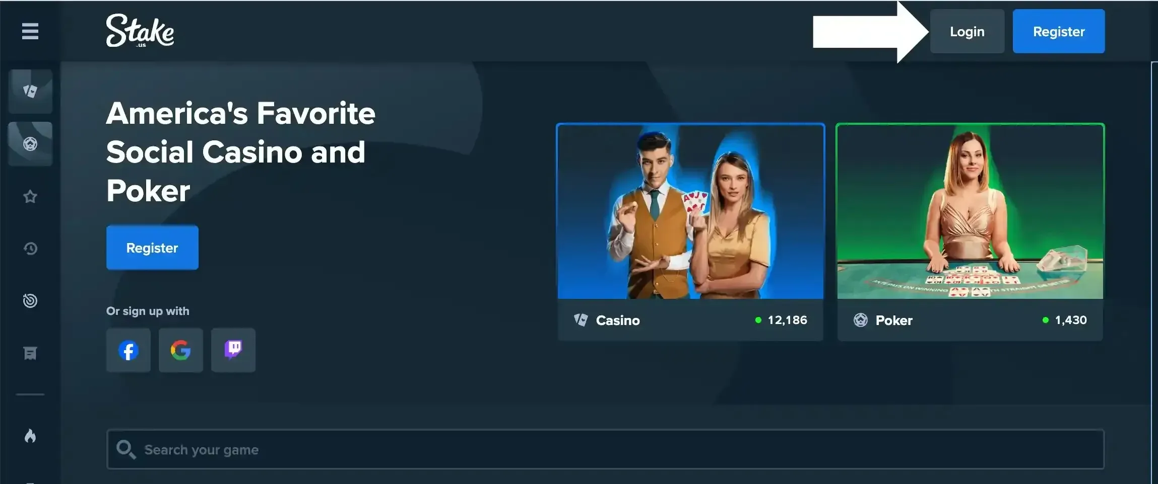 Stake.us Casino gives users the opportunity to log in via Facebook, Google, and Twitch, too. If you prefer this method, click on the icon of the account you want to link to Stake.us Casino to start playing.